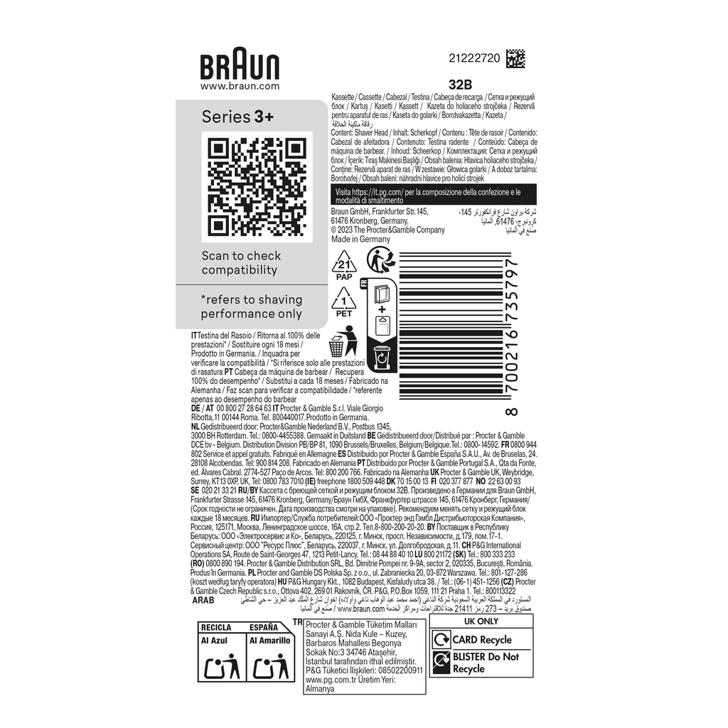 The Braun 32B Series 3 Replacement Head comes complete with a foil and cutter cassette with Microcomb for superior performance and efficiency. This replacement part effectively removes and trims facial hair with scraping your skin for safety and convenient use. It's made compatible with the new generation Series 3 and CruZer clean shave. For best results, replace your Braun shaver parts every 18 months to maintain peak performance.