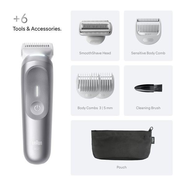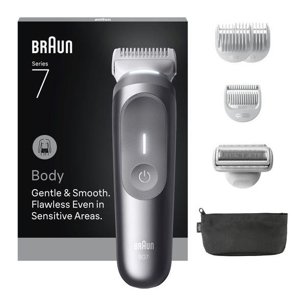 BRAUN Series 7 BG7550 Wet & Dry Body Groomer - Grey, Cordless, Water washable, 5 positions, LED light, Includes: 4 attachments & storage pouch, 2 year guarantee