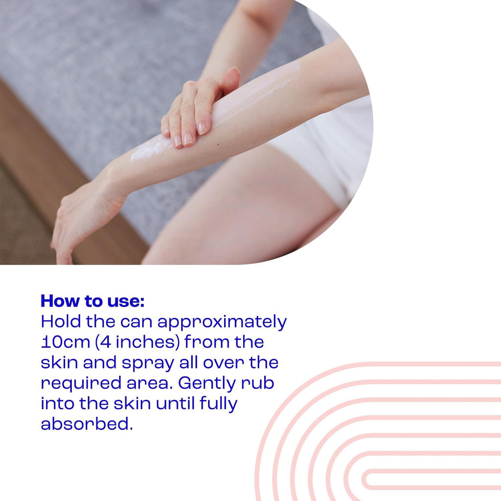 Hold the can approximately 10cm (4 inches) from the skin and spray all over the required area. Smooth over to cover the skin.